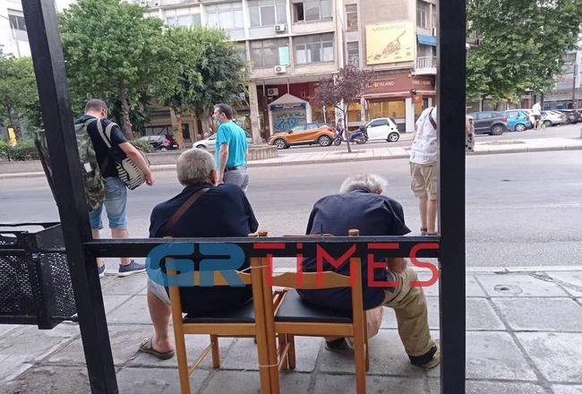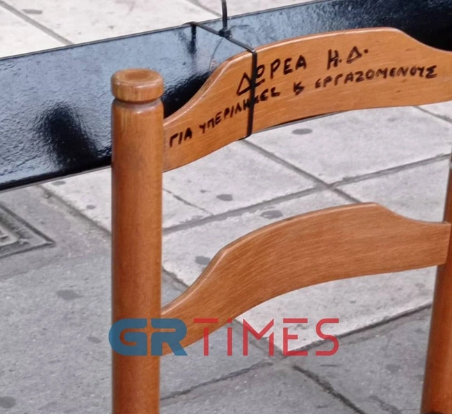 Στις… πατέντες «το έριξαν» αγανακτισμένοι -προφανώς- Θεσσαλονικείς, οι οποίοι βλέπουν εδώ και μέρες να απουσιάζει το παγκάκι από τη στάση λεωφορείων «Πλατεία Δημοκρατίας» στο κέντρο της Θεσσαλονίκης και συγκεκριμένα στην πλατεία Δημοκρατίας. Ετσι λοιπόν, έδεσαν δύο καρέκλες μεταξύ τους και τις τοποθέτησαν «για τους εργαζόμενους και τους υπερήλικες», όπως μάλιστα γράφουν σε σχετικό μήνυμα. Οι καρέκλες είναι δεμένες μεταξύ τους και στη μεταλλική στάση με το υπόστεγο με tie wrap, και αναγράφουν στο μπροστινό μέρος «δωρεά Η.Δ. για υπερήλικες και εργαζόμενους».