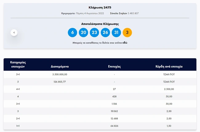Σήμερα, Πέμπτη 4 Αυγούστου 2022, στην κλήρωση Τζόκερ (2475) του ΟΠΑΠ, μοιράζεται στους τυχερούς της πρώτης κατηγορίας το ποσό των 3.500.000 ευρώ. Οι τυχεροί αριθμοί στη σημερινή κλήρωση Τζόκερ είναι οι εξής: 6, 20, 23, 26, 31 και Τζόκερ ο αριθμός 3.