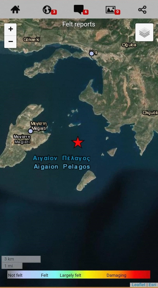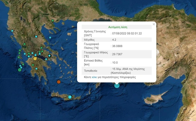 Σεισμική δόνηση μεγέθους 4,3 βαθμών της κλίμακας Ρίχτερ σημειώθηκε στο Καστελόριζο το πρωί της Κυριακής (7/8) στις 11:02, σύμφωνα με το Ευρωμεσογειακό Σεισμολογικό Κέντρο. Ο σεισμός σημειώθηκε 15 χιλιόμετρα ανατολικά νοτιοανατολικά της Μεγίστης και είχε εστιακό βάθος 10 χιλιόμετρα, ενώ νωρίτερα είχε καταγραφεί ως σεισμός 4,2 Ρίχτερ από το Γεωδυναμικό Ινστιτούτο.