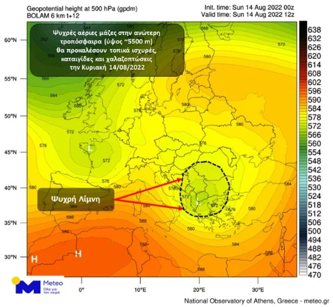 Βάσει των προγνωστικών στοιχείων του Εθνικού Αστεροσκοπείου Αθηνών / Meteo.gr, η ψυχρή λίμνη θα κινηθεί νότια και την Κυριακή, 14 Αυγούστου, θα βρεθεί στην ανώτερη ατμόσφαιρα της χώρας μας (Χάρτης 1), συνεχίζοντας την καιρική αστάθεια για τέταρτη συνεχόμενη ημέρα. Εξαιτίας της θέσης της ψυχρής λίμνης, εκτός από τις ηπειρωτικές περιοχές, αναμένεται να προκαλέσει φαινόμενα και στις νησιωτικές περιοχές, όπου λόγω της περιόδου των θερινών διακοπών, θα πρέπει να δοθεί ιδιαίτερη προσοχή και μέριμνα στις θαλάσσιες δραστηριότητες, αφού οι βροχές και οι τοπικές καταιγίδες θα συνοδεύονται πρόσκαιρα από ισχυρούς ανέμους (μπουρίνια) κυρίως στο Κεντρικό Ιόνιο, στις Σποράδες και στα νησιά του Βορείου Αιγαίου.