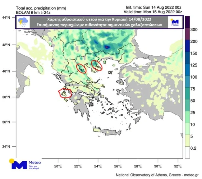 Την Κυριακή, 14 Αυγούστου, σύμφωνα με τα τελευταία προγνωστικά στοιχεία του Εθνικού Αστεροσκοπείου Αθηνών / Meteo.gr, αναμένονται αρχικά τοπικές βροχές ή καταιγίδες σε Ιόνιο, Ήπειρο, Μακεδονία, Θεσσαλία, οι οποίες βαθμιαία θα επεκταθούν στα υπόλοιπα ηπειρωτικά, αλλά και στην Εύβοια και στα νησιά του Βορείου Αιγαίου. Τα φαινόμενα ενδέχεται να είναι κατά τόπους έντονα και να συνοδεύονται από χαλαζοπτώσεις τις μεσημεριανές και απογευματινές ώρες στα ηπειρωτικά, έως το μεσημέρι στο Κεντρικό Ιόνιο και τις βραδινές κυρίως ώρες στο Βορειοανατολικό Αιγαίο. Στον παρακάτω Χάρτη 2, εμφανίζεται το εκτιμώμενο συνολικό ύψος βροχόπτωσης για την Κυριακή, 14 Αυγούστου, καθώς επίσης και οι περιοχές όπου αναμένονται σημαντικές χαλαζοπτώσεις: