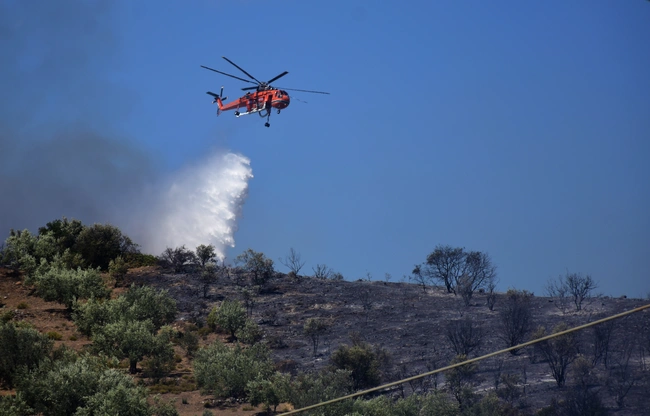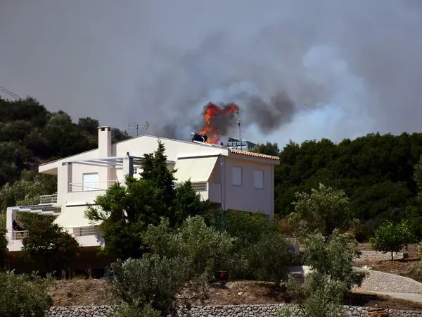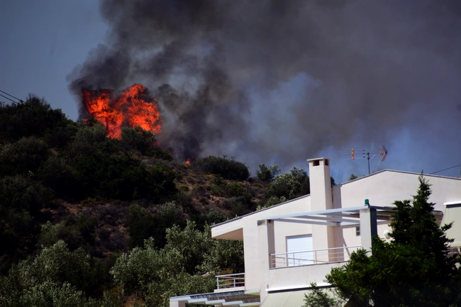 Φωτιά καίει στα Πυργιώτικα Ναυπλίου, στην Αργολίδα, που ξέσπασε το μεσημέρι της Δευτέρας, 15 Αυγούστου. Η φωτιά καίει πολύ κοντά στο ξενοδοχείο Περιβόλι Country Hotel & Retreat, που εκκενώθηκε προληπτικά ενώ απειλούνται και σπίτια του χωριού.