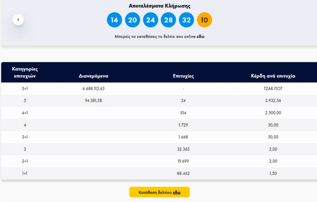 Εκ νέου τζακ ποτ και σήμερα, Τρίτη Αυγούστου 2022, στην κλήρωση Τζόκερ (2480) του ΟΠΑΠ, που μοίραζε στους τυχερούς της πρώτης κατηγορίας το ποσό των περίπου 6.688.000 ευρώ. Οι τυχεροί αριθμοί στη σημερινή κλήρωση Τζόκερ είναι οι εξής: 14, 20, 24, 28, 32 και Τζόκερ ο αριθμός 10 .