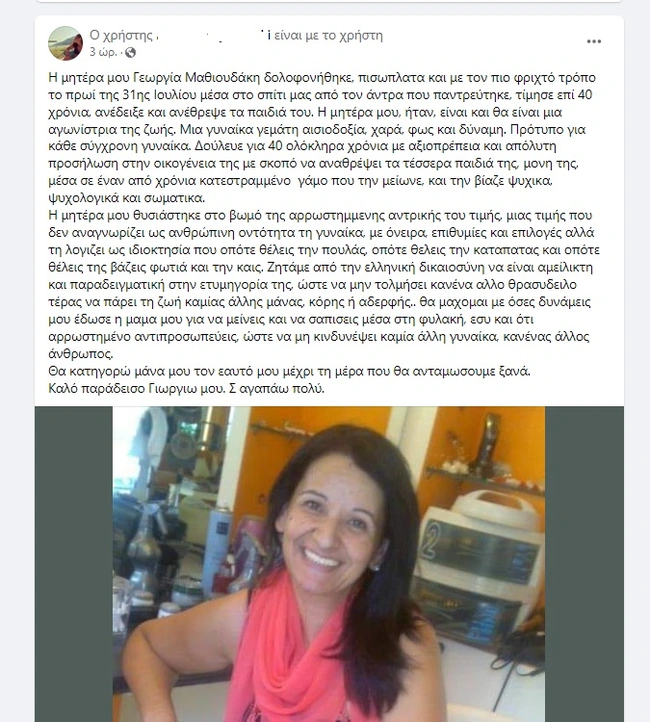 «Η μητέρα μου Γεωργία Μαθιουδάκη δολοφονήθηκε, πισώπλατα και με τον πιο φριχτό τρόπο το πρωί της 31ης Ιουλίου μέσα στο σπίτι μας από τον άντρα που παντρεύτηκε, τίμησε επί 40 χρόνια, ανέδειξε και ανέθρεψε τα παιδιά του. Η μητέρα μου, ήταν, είναι και θα είναι μια αγωνίστρια της ζωής. Μια γυναίκα γεμάτη αισιοδοξία, χαρά, φως και δύναμη. Πρότυπο για κάθε σύγχρονη γυναίκα. Δούλευε για 40 ολόκληρα χρόνια με αξιοπρέπεια και απόλυτη προσήλωση στην οικογένεια της με σκοπό να αναθρέψει τα τέσσερα παιδιά της, μόνη της, μέσα σε έναν από χρόνια κατεστραμμένο γάμο που την μείωνε, και την βίαζε ψυχικά, ψυχολογικά και σωματικά.