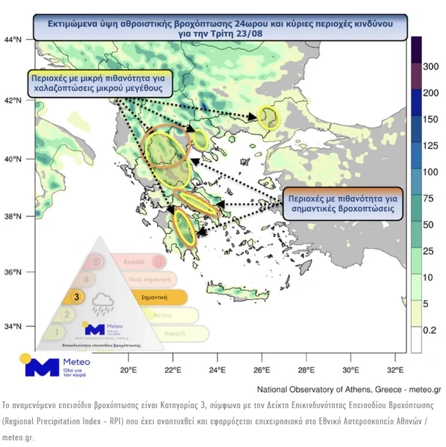 Το αναμενόμενο επεισόδιο βροχόπτωσης είναι Κατηγορίας 3, σύμφωνα με τον Δείκτη Επικινδυνότητας Επεισοδίου Βροχόπτωσης (Regional Precipitation Index - RPI) που έχει αναπτυχθεί και εφαρμόζεται επιχειρησιακά στο Εθνικό Αστεροσκοπείο Αθηνών / meteo.gr.