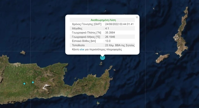 Σεισμική δόνηση μεγέθους 4,1 βαθμών της κλίμακας Ρίχτερ σημειώθηκε νωρίς το πρωί της Τετάρτης (24/8) βόρεια του νομού Λασιθίου στην Κρήτη με αποτέλεσμα να ξυπνήσουν... απότομα οι κάτοικοι της περιοχής. Συγκεκριμένα, σύμφωνα με το Γεωδυναμικό Ινστιτούτο ο σεισμός σημειώθηκε στις 06:44 νωρίς το πρωί, 23 χιλιόμετρα βόρεια, βορειοανατολικά της Σητείας, ενώ είχε εστιακό βάθος 13 χιλιόμετρα.