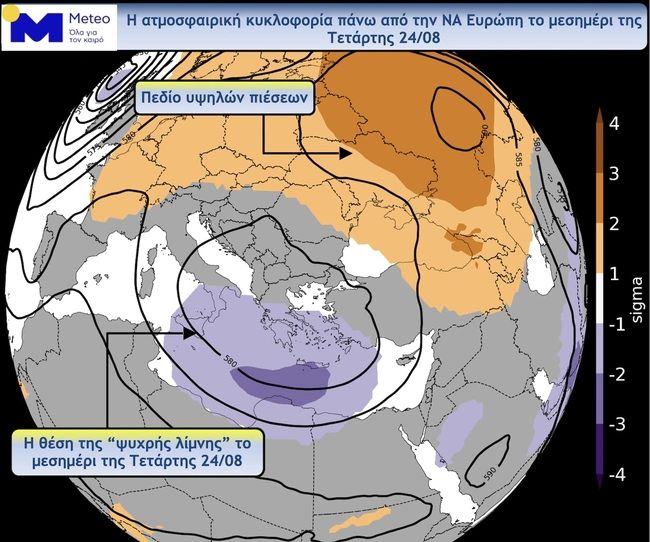 Οσον αφορά για το τι μέλλει γενέσθαι, η ατμοσφαιρική διαταραχή στη νοτιοανατολική Ευρώπη, που δίνει βροχές και καταιγίδες σε μεγάλο μέρος της Ελλάδας τις τελευταίες ημέρες, αναμένεται σήμερα, Τετάρτη (24/8), να αποκοπεί από τη γενική κυκλοφορία και να κινηθεί προς τη χώρα μας, σύμφωνα με τα νεότερα προγνωστικά στοιχεία του Εθνικού Αστεροσκοπείου Αθηνών/ meteo.gr. Ετσι, ως αποκομμένο χαμηλό, η «ψυχρή λίμνη» αναμένεται να διατηρηθεί σχεδόν στάσιμη πάνω από την Ελλάδα για τις επόμενες τρεις ημέρες, με αποτέλεσμα να διατηρηθούν οι βροχές και καταιγίδες.