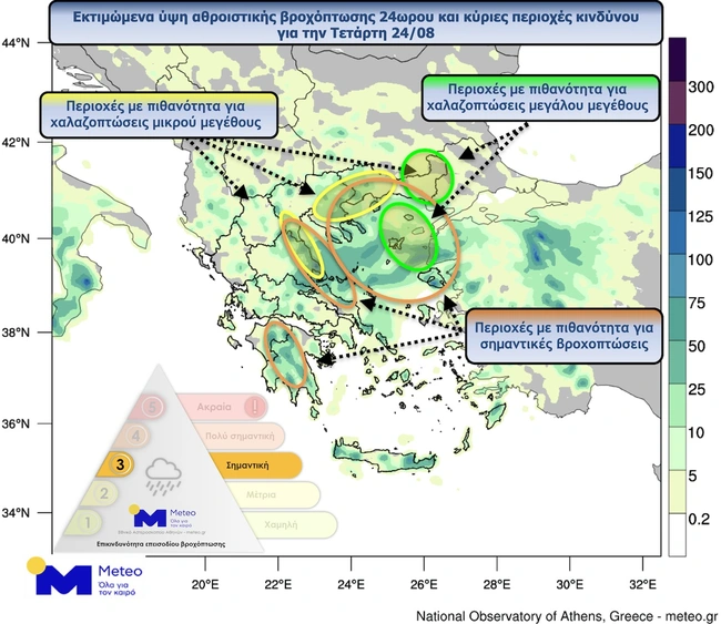 - Τα φαινόμενα κατά τόπους σε τμήματα της κεντρικής και ανατολικής Μακεδονίας, της Θράκης, του Β. Αιγαίου και πιθανώς της Αν. Θεσσαλίας, της Β. Εύβοιας και των Σποράδων θα έχουν μεγαλύτερη διάρκεια και είναι πιθανό να σημειωθούν σημαντικά ύψη βροχής και πιθανώς πλημμυρικά επεισόδια.