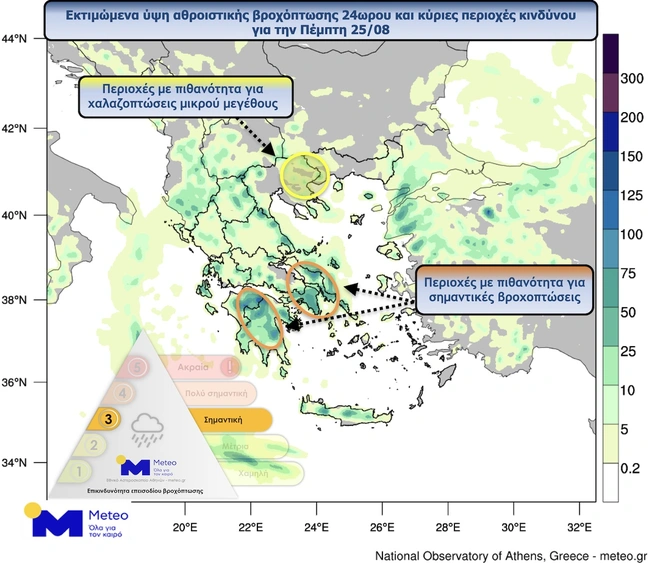 Σήμερα, Πέμπτη 25 Αυγούστου 2022, περιμένουμε βροχές και καταιγίδες στις περισσότερες περιοχές της χώρας. Τα φαινόμενα τοπικά θα έντονα κυρίως στα κεντρικά και βόρεια με έμφαση τμήματα της Κ. Μακεδονίας, της Αν. Θεσσαλίας, της Αν. Στερεάς, της Β. Εύβοιας, των Σποράδων και του Β. Αιγαίου. Οι καταιγίδες στην Ήπειρο και τη Δ. Μακεδονία είναι πιθανό να συνοδεύονται από τοπικές χαλαζοπτώσεις μικρού μεγέθους.