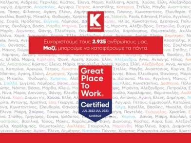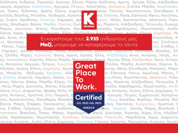 Οι άνθρωποι της εταιρείας είναι αυτοί που ανέδειξαν και πιστοποίησαν την Κωτσόβολος ως Great Place To Work®. Οι εργαζόμενοί της σε Ελλάδα και Κύπρο, κλήθηκαν να αξιολογήσουν την εταιρεία για την εργασιακή της κουλτούρα, το εργασιακό περιβάλλον, την αξιοπιστία, τον σεβασμό στον άνθρωπο, τη διαφορετικότητα, τη συντροφικότητα, την εσωτερική δικαιοσύνη και την υπερηφάνεια τους για την εταιρεία, μέσα από το ερωτηματολόγιο Trust IndexTM. Τα αποτελέσματα της έρευνας αντανακλούν τις δράσεις της εταιρείας και αποτελούν κίνητρο και δέσμευση για ακόμα περισσότερες ενέργειες γύρω από τον στόχο της Κωτσόβολος, να επενδύει συνεχώς στους ανθρώπους της.