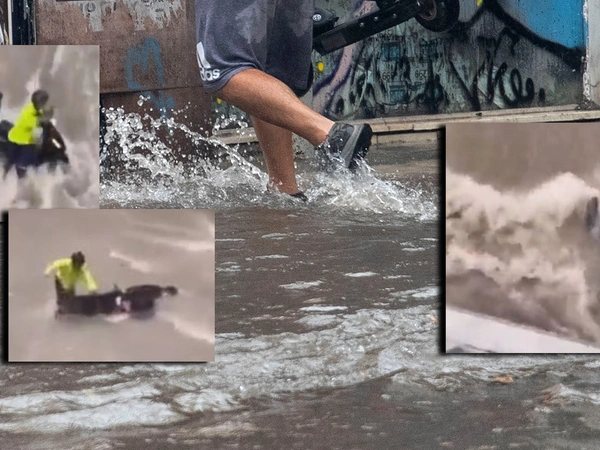 Μάλιστα, ενώ ο ίδιος καταφέρνει να σηκωθεί, τελικά το δίκυκλο παρασύρεται από τα ορμητικά νερά.