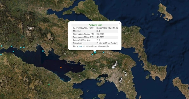 Σεισμός 3,9 Ρίχτερ σημειώθηκε το πρωί του Σαββάτου (3/9) στις 11:27 στη Βοιωτία, με αποτέλεσμα να γίνει αισθητός στην Αθήνα. Σύμφωνα με την αυτόματη λύση του Γεωδυναμικού Ινστιτούτου, το επίκεντρο του σεισμού εντοπίζεται στα 3 χιλιόμετρα ανατολικά της Θήβας και το εστιακό βάθος ήταν 8,3 χιλιόμετρα. Ο πρόεδρος του ΟΑΣΠ, Ευθύμιος Λέκκας, δήλωσε στον ΣΚΑI ότι ο εν λόγω σεισμός εντάσσεται στο πλαίσιο της σεισμικής δραστηριότητας που υπάρχει στη Θήβα εδώ και 1,5 χρόνο. Οι σεισμολόγοι, πρόσθεσε, θα μπορούν να πουν περισσότερα για το σεισμό όταν αναλύσουν περισσότερο τα χαρακτηριστικά του.