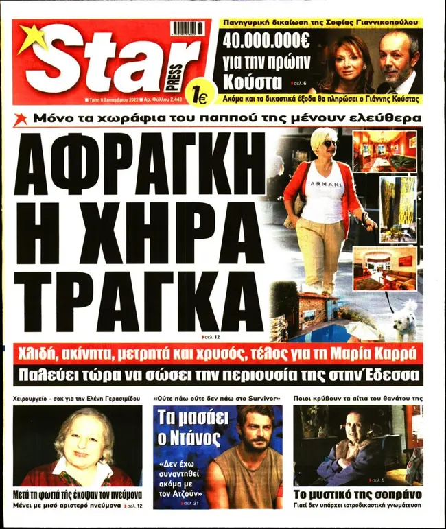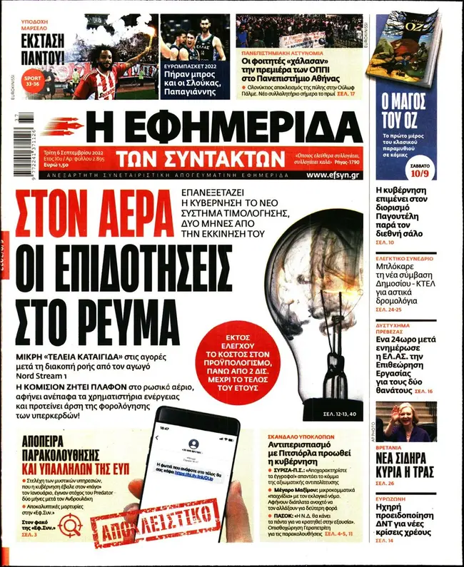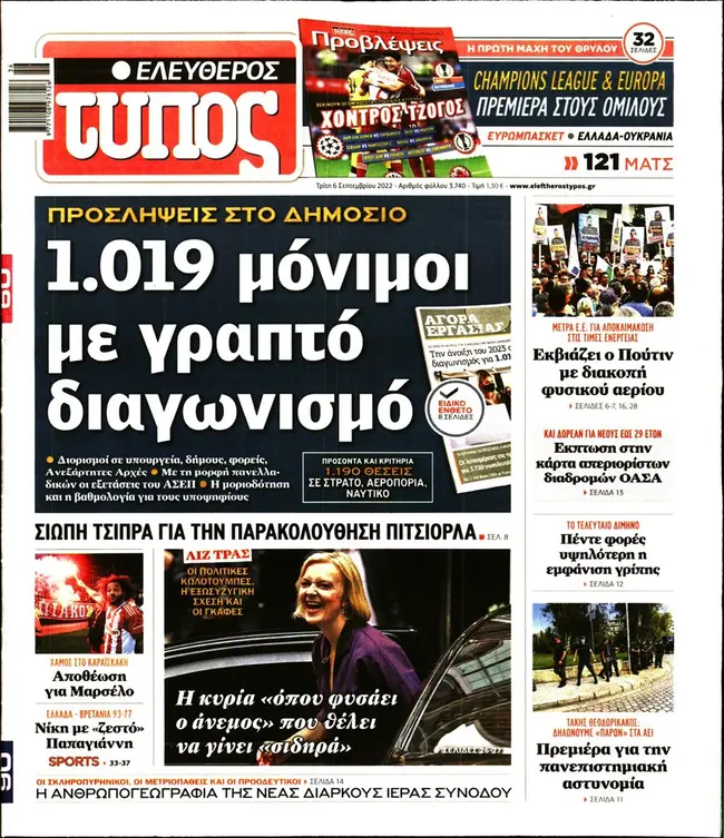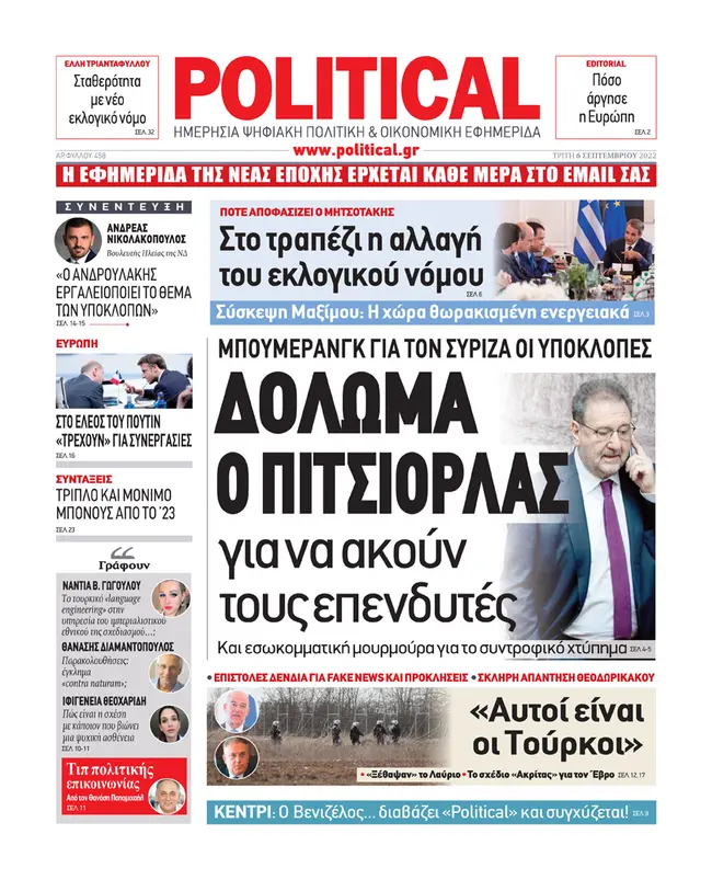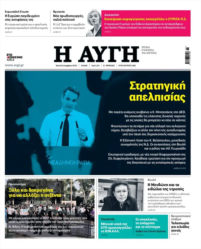 Τα πρωτοσέλιδα των ελληνικών εφημερίδων για σήμερα Τρίτη 6 Σεπτεμβρίου. Δείτε τι φιλοξενεί στην πρώτη του σελίδα ο πολιτικός και οικονομικός Τύπος και τα θέματα της επικαιρότητας που ξεχωρίζουν.