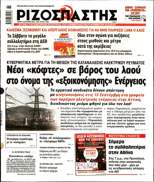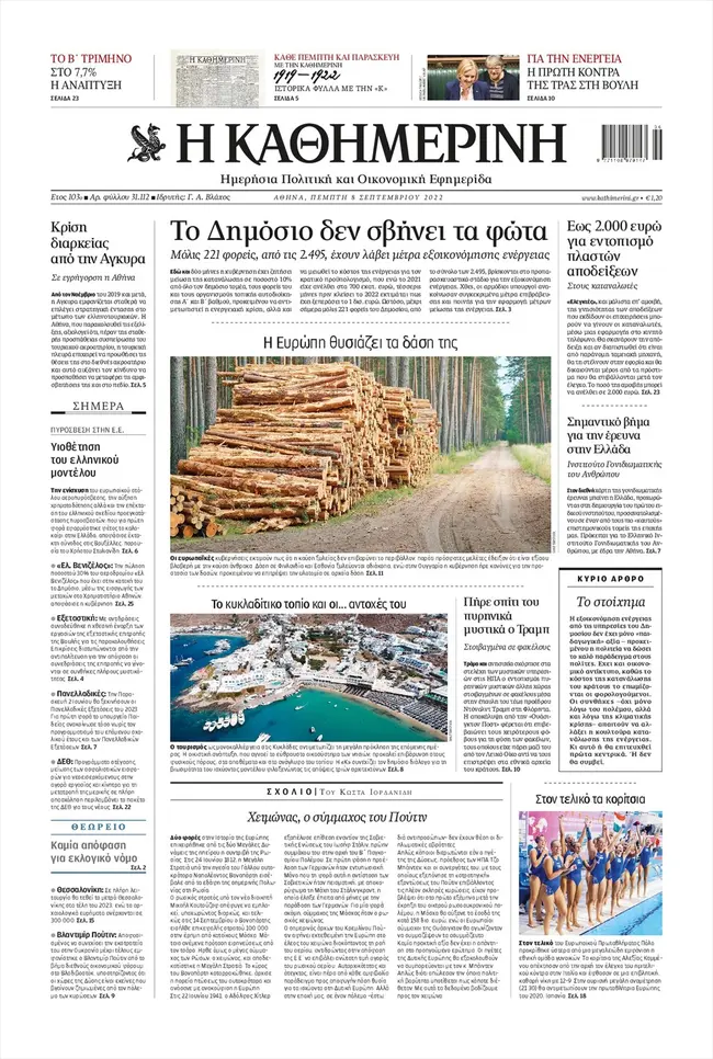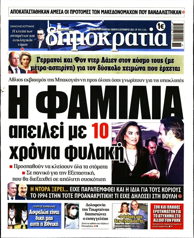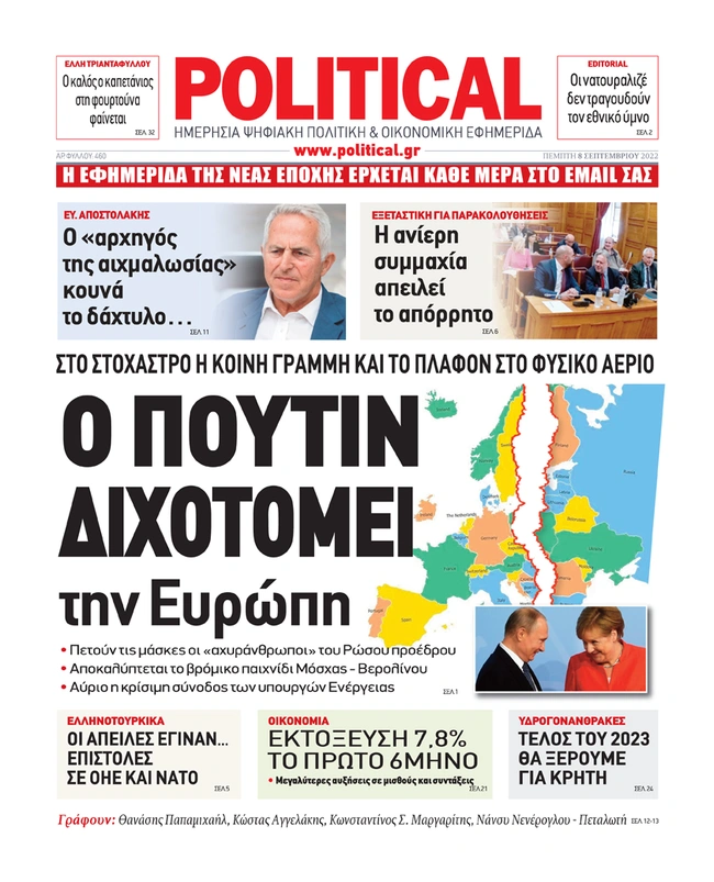 Τα πρωτοσέλιδα των ελληνικών εφημερίδων για σήμερα Πέμπτη 8 Σεπτεμβρίου. Δείτε τι φιλοξενεί στην πρώτη του σελίδα ο πολιτικός και οικονομικός Τύπος και τα θέματα της επικαιρότητας που ξεχωρίζουν.