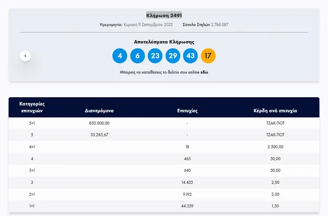 Σήμερα, Κυριακή 11 Σεπτεμβρίου 2022, στην κλήρωση Τζόκερ (2491) του ΟΠΑΠ, μοιράζεται στους τυχερούς της πρώτης κατηγορίας το ποσό των 850.000 ευρώ. Οι τυχεροί αριθμοί στη σημερινή κλήρωση Τζόκερ είναι οι εξής: 4, 6, 23, 29, 43 και Τζόκερ ο αριθμός 17.