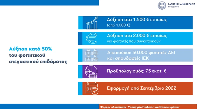 Το φοιτητικό στεγαστικό επίδομα θα αυξηθεί από τα 1.000 στα 1.500 ευρώ (αύξηση 50%) και στις 2.000 ευρώ σε περιπτώσεις φοιτητών που συγκατοικούν. Δικαιούχοι του διευρυμένου επιδόματος είναι 50.000 φοιτητές και σπουδαστές δημόσιων ΙΕΚ.