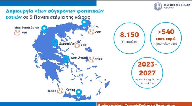 Πρόσθεσε ότι θα δημιουργηθούν σύγχρονες φοιτητικές εστίες σε 5 πανεπιστήμια της χώρας, το Δημοκρίτειο Πανεπιστήμιο Θράκης (700 άτομα), το Πανεπιστήμιο Κρήτης (4.850 άτομα), το Πανεπιστήμιο Δυτικής Μακεδονίας (750 άτομα), το Πανεπιστήμιο Θεσσαλίας (750 άτομα) και το Πανεπιστήμιο Δυτικής Αττικής (1.100 άτομα).