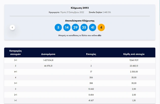 Σήμερα, Πέμπτη 15 Σεπτεμβρίου 2022, στην κλήρωση Τζόκερ (2493) του ΟΠΑΠ, μοιράζεται στους τυχερούς της πρώτης κατηγορίας το ποσό των περίπου 1.500.000 ευρώ. Οι τυχεροί αριθμοί στη σημερινή κλήρωση Τζόκερ είναι οι εξής: 5, 14, 29, 35, 41 και Τζόκερ ο αριθμός 4.