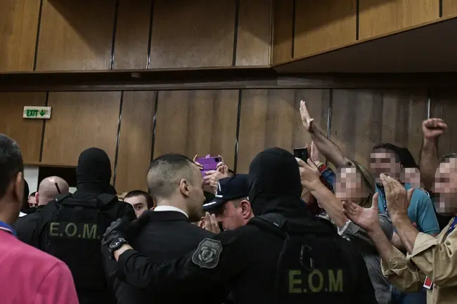 Οι θιασώτες των ναζί έκαναν και πάλι την εμφάνισή τους στο δικαστήριο, αποθεώνοντας το πρωτοπαλίκαρο του Νίκου Μιχαλολιάκου, τον Ηλία Κασιδιάρη, ο οποίος προκάλεσε για μία ακόμα φορά με τη συμπεριφορά του. Ο φυλακισμένος χρυσαυγίτης, ηγετικό μέλος της εγκληματικής οργάνωσης Χρυσή Αυγή. Από την αρχή της διαδικασίας περίπου 30 άτομα υποδέχθηκαν με χειροκροτήματα τους φυλακισμένους πρώην βουλευτές της Χρυσής Αυγής Λαγό-Κασιδιάρη, ενώ παρών στο δικαστήριο είναι και ο Στάθης Μπούκουρας.