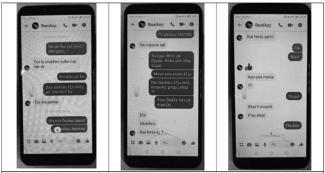Για την επικοινωνία τους τα μέλη των συμμοριών χρησιμοποιούσαν και διαδικτυακές εφαρμογές. Στις παραπάνω φωτογραφίες, που περιλαμβάνονται στο διαβιβαστικό της Ασφάλειας, αποτυπώνεται ενδεικτικά μέρος των επικοινωνιών που είχαν οι οποίες αφορούσαν σε ναρκωτικά κα. Στις φωτογραφίες αποτυπώνεται συνομιλία όπου ένα μέλος των συμμοριών ζητά από έτερο μέλος να του βγάλει «λίγο» εννοώντας μικρή ποσότητα ναρκωτικής ουσίας. Η απάντηση είναι ότι θα του βγάλει ένα «ολόκληρο».
