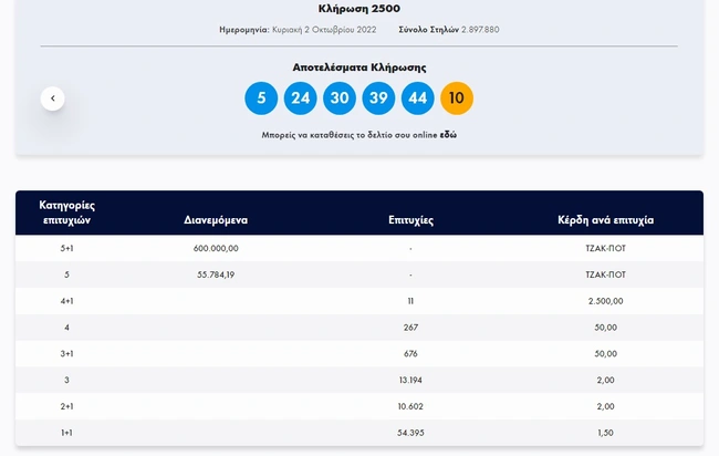Σήμερα, Κυριακή 2 Οκτωβρίου 2022, στην κλήρωση Τζόκερ (2500) του ΟΠΑΠ, μοιράζεται στους τυχερούς της πρώτης κατηγορίας το ποσό των 600.000 ευρώ. Οι τυχεροί αριθμοί στη σημερινή κλήρωση Τζόκερ είναι οι εξής: 5, 24, 30, 39, 44 και Τζόκερ ο αριθμός 10.