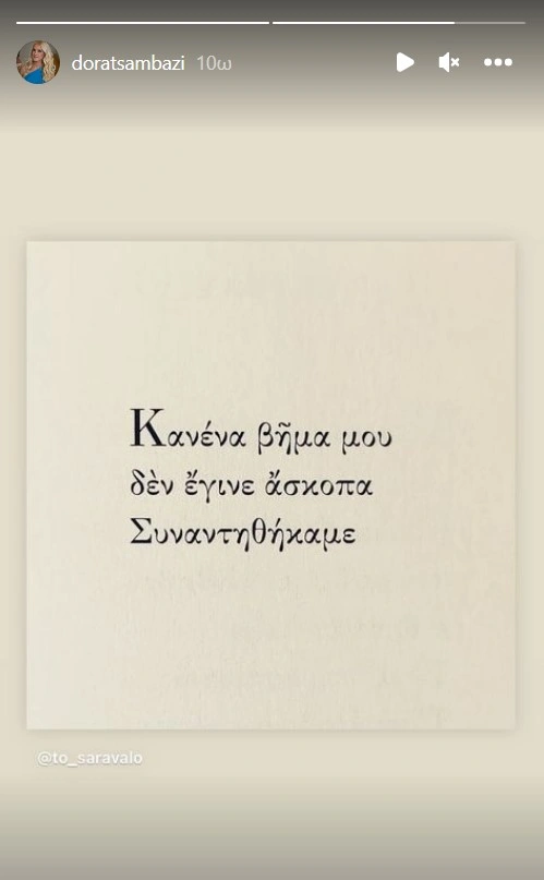 Το βράδυ της Παρασκευής η δημοσιογράφος κοινοποίησε στο Instagram ένα νέο story που έγραφε: «Κανένα βήμα μου δεν έγινε άσκοπα. Συναντηθήκαμε», που αποτελεί στίχο της Κορίνας Καλούδη από τη συλλογή: «Χρειάστηκε να κλέψω» και συγκίνησε τους ακολούθους της.