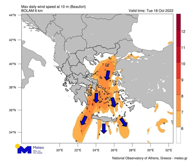 - Ανεμοι: Βόρειοι βορειοανατολικοί 7 με 8 μποφόρ, με μικρή εξασθένηση από το απόγευμα.