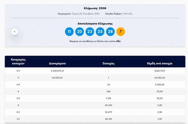 Σήμερα, Πέμπτη 20 Οκτωβρίου 2022, στην κλήρωση Τζόκερ (2508) του ΟΠΑΠ, μοιράζεται στους τυχερούς της πρώτης κατηγορίας το ποσό των 3.200.000 ευρώ. Οι τυχεροί αριθμοί στη σημερινή κλήρωση Τζόκερ είναι οι εξής: 11, 20, 23, 25, 28 και Τζόκερ ο αριθμός 7.
