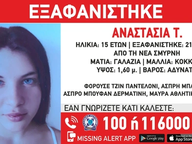 Από δομή παιδικής προστασίας στη Νέα Σμύρνη εξαφανίστηκε το πρωί της Παρασκευής (21/10) η Αναστασία Τ., 15 ετών. Οπως αναφέρεται σε σχετική ανακοίνωση, το «Χαμόγελο του Παιδιού» ενημερώθηκε άμεσα για την εξαφάνιση και προχώρησε στη δημοσιοποίηση των στοιχείων της ανήλικης κατόπιν εισαγγελικής εντολής καθώς συντρέχουν λόγοι που θέτουν τη ζωή της σε κίνδυνο καθώς πιθανόν να είναι εγκλωβισμένη σε μια επικίνδυνη κατάσταση από την οποία δεν μπορεί να διαφύγει. Η Αναστασία Τ. έχει ύψος 1,60 μ., είναι αδύνατη, έχει κόκκινα μαλλιά και γαλάζια μάτια. Φορούσε άσπρη μπλούζα, τζιν παντελόνι, άσπρο μπουφάν δερματίνη, μαύρα αθλητικά παπούτσια.