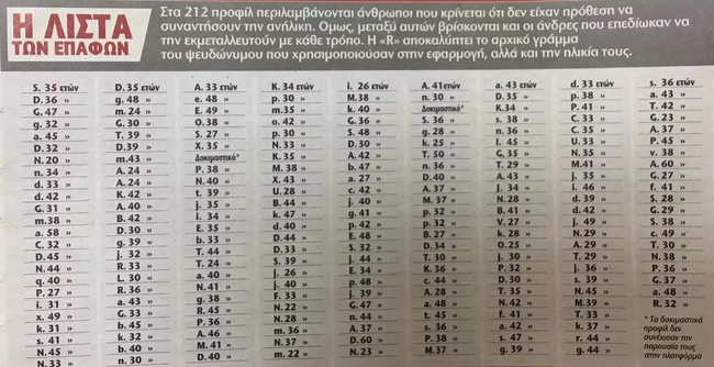 Ετσι, σύμφωνα με την εφημερίδα «Real News», οι άνθρωποι που έστειλαν τουλάχιστον ένα μήνυμα είναι στην πλειοψηφία τους κάτω των 45 ετών. Ωστόσο, ανάμεσα τους υπάρχουν άτομα ηλικίας 60 ετών, ενώ οι νεότεροι είναι 20 ετών. Η αστυνομία γνωρίζει πλέον την ηλεκτρονική ταυτότητα των υπολογιστών ή άλλων συσκευών (IP) και των 212 χρηστών της εφαρμογής. Παράλληλα, έχουν τα e-mails, και τα ψευδώνυμα (usernames) που χρησιμοποιούσαν, ενώ πέντε χρήστες είχαν καταχωρημένο και τον αριθμό του κινητού τηλεφώνου τους.