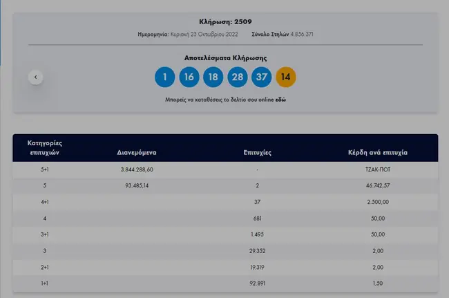 Σήμερα, Κυριακή 23 Οκτωβρίου 2022, στην κλήρωση Τζόκερ (2509) του ΟΠΑΠ, μοιράζεται στους τυχερούς της πρώτης κατηγορίας το ποσό των περίπου 3.850.000 ευρώ. Οι τυχεροί αριθμοί στη σημερινή κλήρωση Τζόκερ είναι οι εξής: 1, 16, 18, 28, 37 και Τζόκερ ο αριθμός 14.