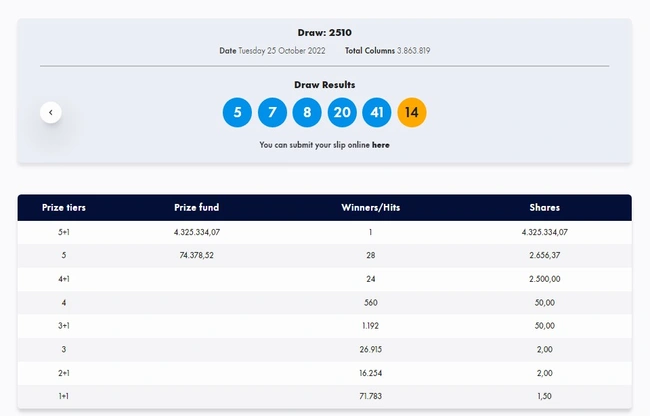 Σήμερα, Τρίτη 25 Οκτωβρίου 2022, στην κλήρωση Τζόκερ (2510) του ΟΠΑΠ, ένας ήταν ο υπερτυχερός της πρώτης κατηγορίας που βρήκε όλους τους τυχερούς αριθμούς και θα πάρει το ποσό των 4.325.334.07 ευρώ - Δείτε τους τυχερούς αριθμούς. Οι τυχεροί αριθμοί στη σημερινή κλήρωση Τζόκερ είναι οι εξής: 5, 7 8, 20, 41 και Τζόκερ ο αριθμός 14.