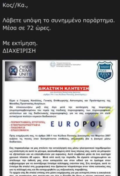 Στη συγκεκριμένη περίπτωση οι δράστες στην προσπάθειά τους να εξαπατήσουν τους χρήστες του Διαδικτύου χρησιμοποιούν τα στοιχεία του Γενικού Επιθεωρητή Αστυνομίας Νοτίου Ελλάδας, Αντιστράτηγου Γεώργιου Κανέλλου, σε επιστολή που φέρει λογότυπα της Διεύθυνσης Δίωξης Ηλεκτρονικού Εγκλήματος, του Υπουργείου Δικαιοσύνης και ενημερωτικού ιστότοπου, επιχειρώντας να δημιουργήσουν την εντύπωση ότι προέρχεται από την Ελληνική Αστυνομία. Στο πλαίσιο αυτό ανακοινώνεται από την ΕΛ.ΑΣ ότι το εν λόγω κείμενο – μήνυμα που διακινείται μέσω ηλεκτρονικού ταχυδρομείου (e-mail), ως δήθεν επιστολή του Γενικού Επιθεωρητή Αστυνομίας Νοτίου Ελλάδας είναι καταφανώς ψευδεπίγραφο και απατηλό.