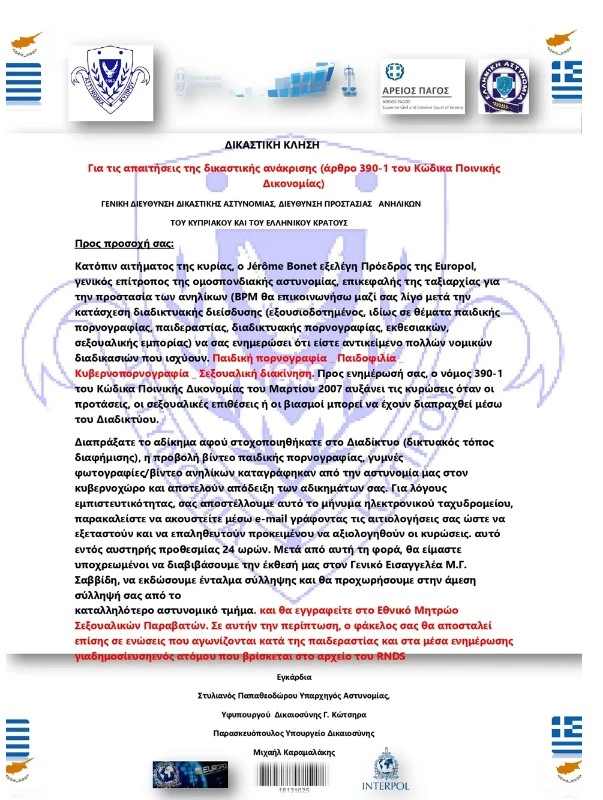Παράλληλα, στην προσπάθειά τους να προσδώσουν «αληθοφάνεια» στη σχετική επιστολή, χρησιμοποιούν τα λογότυπα της Ελληνικής Αστυνομίας, της Αστυνομίας Κύπρου, του υπουργείου Δικαιοσύνης, καθώς και δικαστικών αρχών και αρχών επιβολής του νόμου. Αναλυτικά, οι δράστες, προσποιούμενοι τις αρμόδιες ελεγκτικές Αρχές, διακινούν επιστολή μέσω ηλεκτρονικής αλληλογραφίας και προσπαθούν να εξαπατήσουν τους πολίτες, με το πρόσχημα ότι ο αποδέκτης τους εμπλέκεται σε υπόθεση πορνογραφίας και άλλων αδικημάτων.