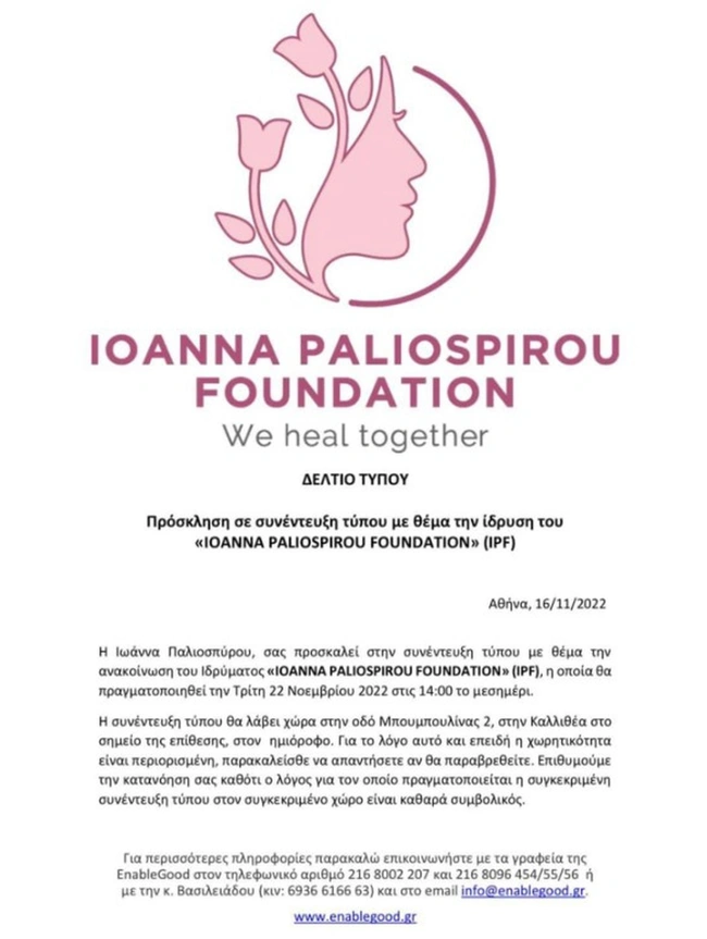 Η συνέντευξη τύπου για την παρουσίαση του Ioanna Paliospyrou Foundation (IPF) θα γίνει την Τρίτη 22 Νοεμβρίου στις 14:00, στην Καλλιθέα. Το σημείο της παρουσίασης αυτής της πρωτοβουλίας, έχει συμβολική σημασία: Πρόκειται για το σημείο, όπου έγινε η επίθεση με βιτριόλι από την Έφη Κακαράντζουλα στην Ιωάννα Παλιοσπύρου, το 2020.