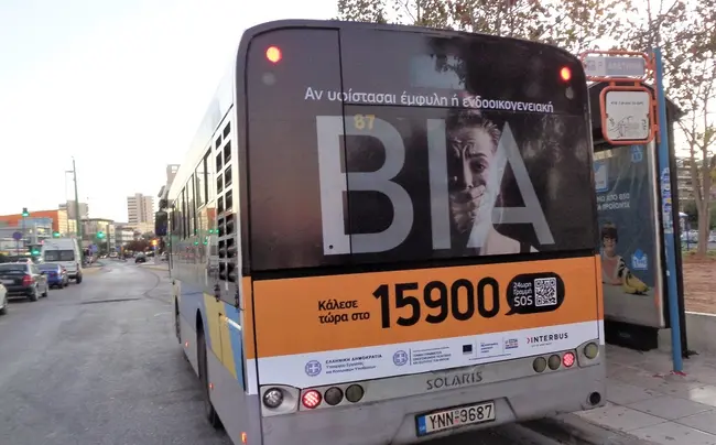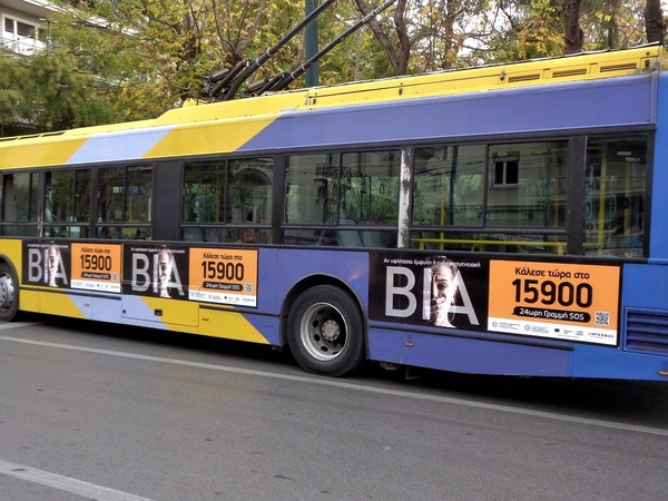«Αν υφίστασαι έμφυλη ή ενδοοικογενειακή βία, κάλεσε τώρα στο 15900» είναι το ηχηρό μήνυμα της καμπάνιας που υπάρχει στο πίσω μέρος των λεωφορείων και στο πλαϊνό μέρος των τρόλεϊ. Η αφίσα έχει χρώμα πορτοκαλί, χρώμα σύμβολο στον αγώνα για την εξάλειψη της βίας κατά των γυναικών παγκοσμίως.