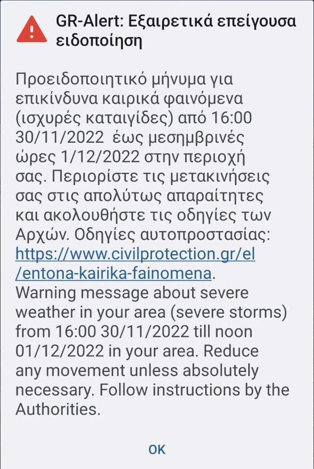 Σημειώνεται ότι τα φαινόμενα την Τετάρτη (30-11-2022) θα είναι κατά τόπους ιδιαίτερα ισχυρά στην κεντρική Μακεδονία (κυρίως νομούς Πιερίας και Χαλκιδικής) και στα βορειοανατολικά τμήματα της Θεσσαλίας.