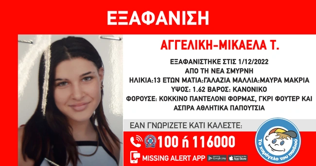 Συναγερμό σήμανε «Το Χαμόγελο του Παιδιού» για την εξαφάνιση της 13χρονης Αγγελικής - Μικαέλας Τ. που εξαφανίστηκε από τη Μονάδα Κοινωνικής Φροντίδας Παιδόπολη «Αγία Βαρβάρα», στην περιοχή της Νέας Σμύρνης. Η ανήλικη εξαφανίστηκε την Πέμπτη 1/12/2022, μεσημεριανές ώρες, ενώ το «Χαμόγελο» ενημερώθηκε σήμερα 03/12/2022 και προχώρησε στη δημοσιοποίηση των στοιχείων της ανήλικης κατόπιν εισαγγελικής εντολής, καθώς συντρέχουν λόγοι που θέτουν τη ζωή της σε κίνδυνο.