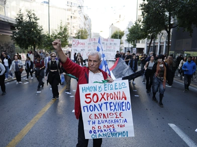 Πορεία για την 50η επέτειο του Πολυτεχνείου στο κέντρο της Αθήνας, με χιλιάδες κόσμου να δηλώνουν το «παρών» για άλλη μία χρονιά.