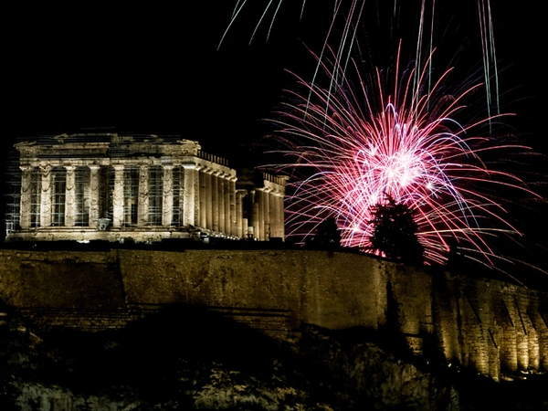 Πολυάριθμα, εντυπωσιακά πυροτεχνήματα φώτισαν τον αθηναϊκό ουρανό πάνω από την Ακρόπολη, τη Βουλή και το Σύνταγμα, δημιουργώντας ένα πραγματικά φαντασμαγορικό θέαμα.