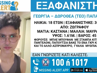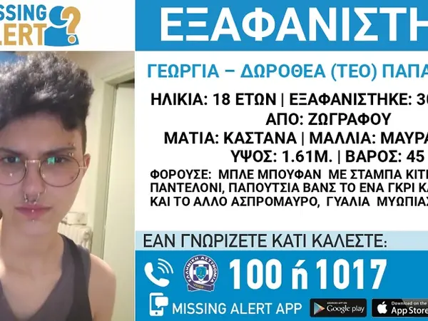 «Στις 29/12/2022, βραδινές ώρες, εξαφανίστηκε από την περιοχή του Ζωγράφου, το ενήλικο άτομο Παπαμήτρου Γεωργία Δωροθέα (Τεό),18 ετών. Το «Χαμόγελο του Παιδιού» ενημερώθηκε για την εξαφάνιση του ενήλικου ατόμου στις 31/12/2022 και προχώρησε στη δημοσιοποίηση των στοιχείων του κατόπιν αιτήματος της οικογένειας του καθώς ενδέχεται να συντρέχουν λόγοι οι οποίοι θέτουν τη ζωή του σε κίνδυνο.