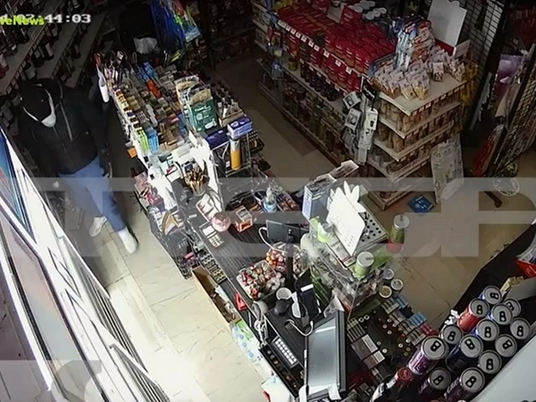 Ο ένας από τους δύο δράστες κατευθύνεται προς το ταμείο. Φοράει μαύρα γάντια, καπέλο και καλύπτει τα χαρακτηριστικά του προσώπου του με ένα δεμένο μαντήλι λευκό. Ανοίγει μία πλαστική σακούλα, όσο κοιτάει προς τα πάνω για κάμερες. Σκύβει πίσω από το γκισέ. Ρίχνει μέσα στη σακούλα όλα τα κέρματα και κοιτάει τι άλλο θα πάρει όσο ο συνεργός του παλεύει να ανοίξει μία μεγάλη μαύρη σακούλα σκουπιδιών. Απομακρύνουν το κόκκινο σκαμπό για να έχουν ελεύθερο τον χώρο και τότε αρχίζουν να μαζεύουν στη σακούλα όλες τις κούτες με τα τσιγάρα.