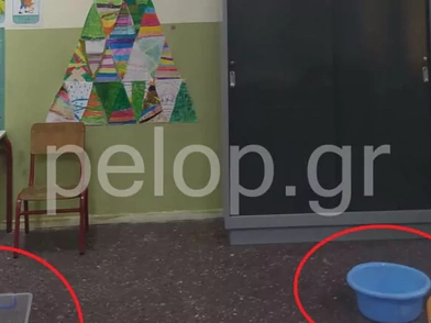 Μαθητές Δημοτικού Σχολείου στην Πάτρα, παρακαλούν να μην πιάσει βροχή, γιατί ούτε η τάξη τούς προστατεύει. Aνάμεσα στα θρανία, είναι απλωμένες λεκάνες στο δάπεδο, για να μαζεύουν το νερό που τρέχει από την οροφή του κτηρίου.