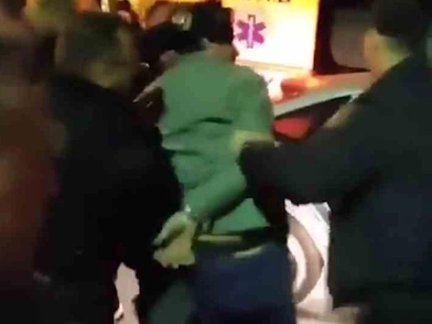 Ο επιχειρηματίας φαίνεται να αρνείται να μπει στο περιπολικό και να προσπαθεί να φύγει, ωστόσο, οι αστυνομικοί που τον κρατάνε, καταφέρνουν να τον ρίξουν στο έδαφος και να τον ακινητοποιήσουν με τους παρευρισκόμενους να ξεσπούν σε έντονες αποδοκιμασίες.