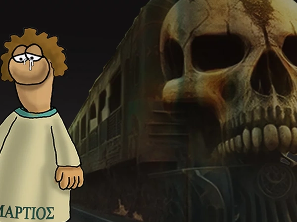 Στην εικόνα του γνωστού σκιτσογράφου αποτυπώνεται ο Μάρτιος να δακρύζει δίπλα σε ένα τρένο που στη μηχανή του έχει μια νεκροκεφαλή.