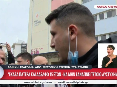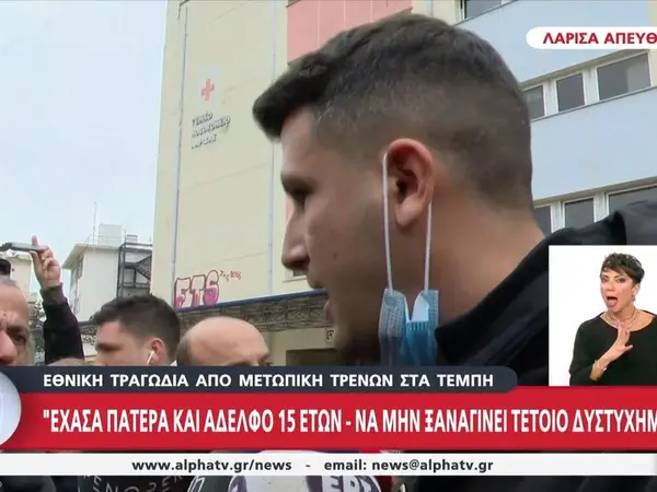 Ενας εξ αυτών κι ο νεαρός που έχασε πατέρα κι αδελφό στην φονική αμαξοστοιχία Intercity 62 που συγκρούστηκε μετωπικά με την εμπορική. Το ξέσπασμα οργής του έξω από το νοσοκομείο της Λάρισας όπου έχει στηθεί ένα σκηνικό ατέλειωτης αρχαίας τραγωδίας, είναι χαρακτηριστικό κι αποτυπώνει όσα βιώνουν όλες οι οικογένειες που έχασαν τους ανθρώπους τους.