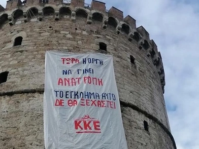 Πανό για το σιδηροδρομικό δυστύχημα στα Τέμπη που είχε σαν αποτέλεσμα να χαθούν άδικα τουλάχιστον 57 άνθρωποι, ανάρτησαν μέλη του ΠΑΜΕ στο μνημείο του Λευκού Πύργου. Συγκεκριμένα, έπειτα από συγκέντρωση μελών του ΚΚΕ στην πλατεία του Λευκού Πύργου, διαδηλωτές ανάρτησαν στην κορυφή του μνημείου ένα πανό που ανέγραφε την εξής φράση: «Τώρα η οργή να γίνει ανατροπή, το έγκλημα αυτό δεν θα ξεχαστεί».
