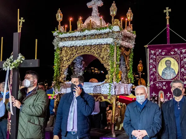 Ο ορθόδοξος Επιτάφιος συναντά τον καθολικό στην πλατεία Μιαούλη, δημιουργώντας μία εντυπωσιακή εικόνα για τους επισκέπτες.