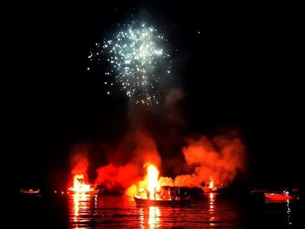 Η σχεδία, με τη βοήθεια κάποιου βαρκάρη μεταφέρεται στο κέντρο της λίμνης και η φωτιά φτάνει από την κορυφή του υψώματος, με τη βοήθεια σχοινιών που επιπλέον κρατούν σταθερή την κατασκευή.