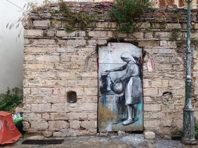 «Είναι Χριστιανή; Εβραία; Μουσουλμάνα δύσκολο γιατί έχει λευκό μαντήλι, αλλά είναι απλά μια νοικοκυρά που γεμίζει νερό» αναφέρει ο Γιώργος Κόφτης, ο ζωγράφος εμπνευστής της καλλιτεχνικής παρέμβασης σε μια κρήνη στην Άνω Πόλη. Όπως εξηγεί στο ΑΠΕ-ΜΠΕ, θέλησε να δώσει ζωή σε μια κρήνη που την «έχει φάει η εγκατάλειψη και η βρωμιά» και αποφάσισε να ζωγραφίσει το ταμπλό από νοβοπάν που χρησιμεύει ως πόρτα.